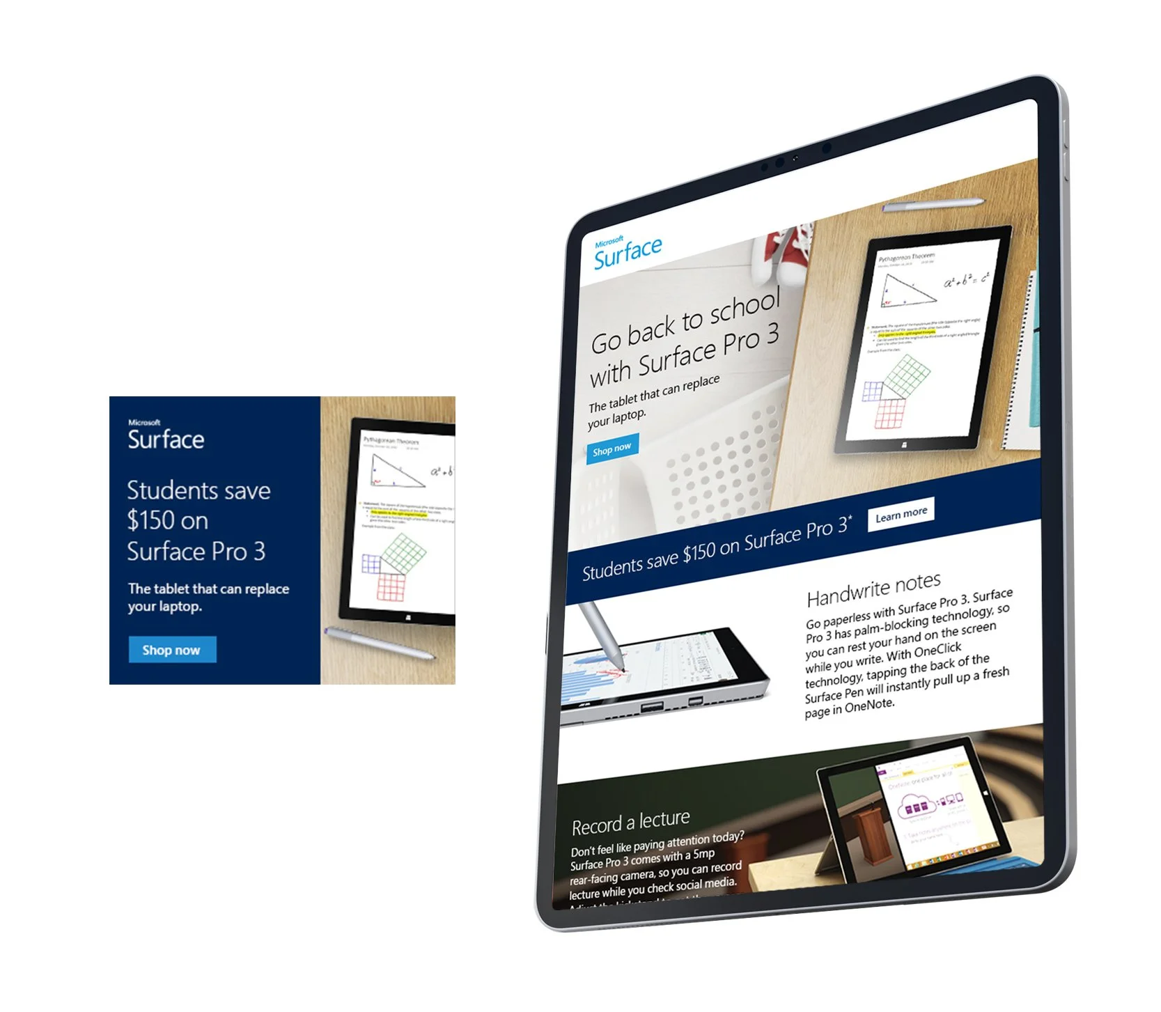 A promotional campaign for Back-to-School season targeted college students and the specific way the device could assist in their education. We didn’t just copy and paste the work – New body copy, images, colors, and UI screens differentiated this from the rest of our deliverables.