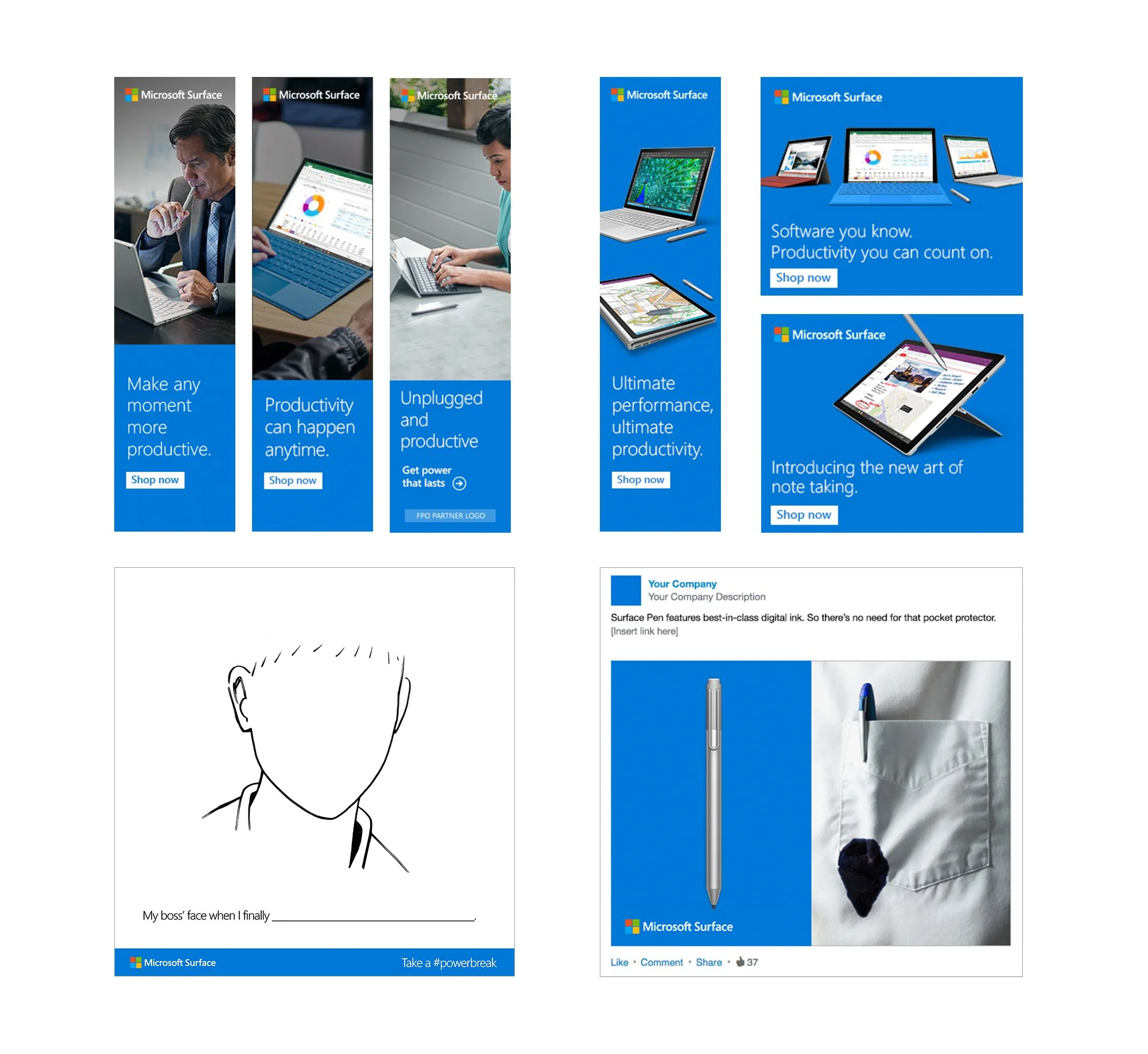 An online ad campaign helped get the message out, while social media posts were crafted to highlight the Surface Pen – a new way to interact with the touch screen device. Surface users were encouraged to use their new pen to complete sketches depicting lighthearted business scenarios.